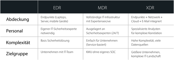 - MDR ergänzt EDR durch ein Experten-Team und eignet sich für KMU am besten.