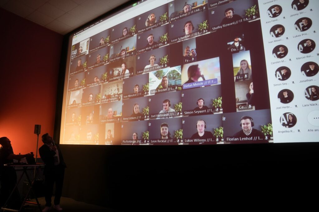 Die Teilnahme kam aus ganz unterschiedlichen Situationen heraus: von der Arbeit, aus dem Fitnessstudio oder beim Spaziergang. Nach und nach füllte sich die Kinoleinwand mit Gesichtern aus der IT Fabrik.